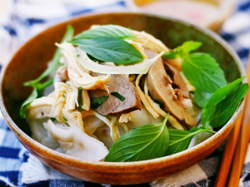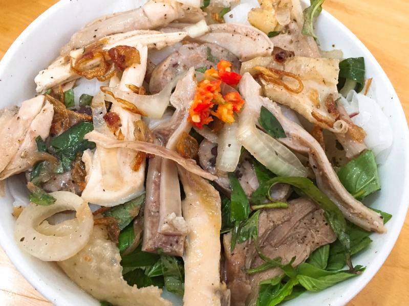 Trong tô bánh ướt thập cẩm gồm có bánh ướt, gỏi gà xé phay vàlòng heo, lá dăm, hành tây, trứng gà non, ớt trộn. Tất cả đều hòa sắc nhìn rất thanh mát và bắt mắt. Khi ăn, bạn sẽ cảm nhận được vị thơm mát của bánh ướt, vị ngọt từ miếng thịt lòng gà, quyện trong vị nước chấmchua dịu ngọt vừa phải, thêm chút cay của ớt, lẫn mùi thơm nồng từ rau thơm. Vừa thoăn thoắt sắp nguyên liệu vào bát, chị Chuyên cho biết với quán hàng chị thì khâu tuyển lựa nguyên liệu được thực hiện khắt khe nhất: