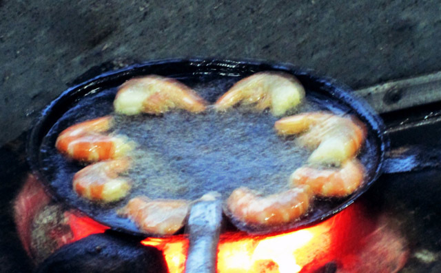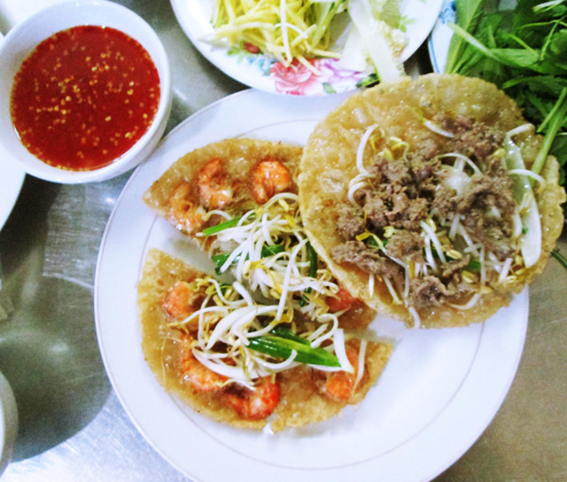 Đến Quy Nhơn vào một buổi chiều tối mùa đông, đoàn chúng tôi được ông chủ khách sạn giới thiệu đến ngay khu phố ẩm thực nổi tiếng Diên Hồng. Nơi đây có khá nhiều đồ ăn ngon như bánh hỏi lòng heo, cháo bò, bánh chả cá…nhưng nổi tiếng hơn cả là Bánh xèo tôm nhảy. Từ đầu phố đã nghe thấy tiếng xèo xèo vui tai và mùi thơm lựng đặc trưng của bột gạo. Chỉ một loáng, chúng tôi đã được phục vụ những khay bánh xèo nóng ròn, vàng ươm, thơm phức và rất bắt mắt.