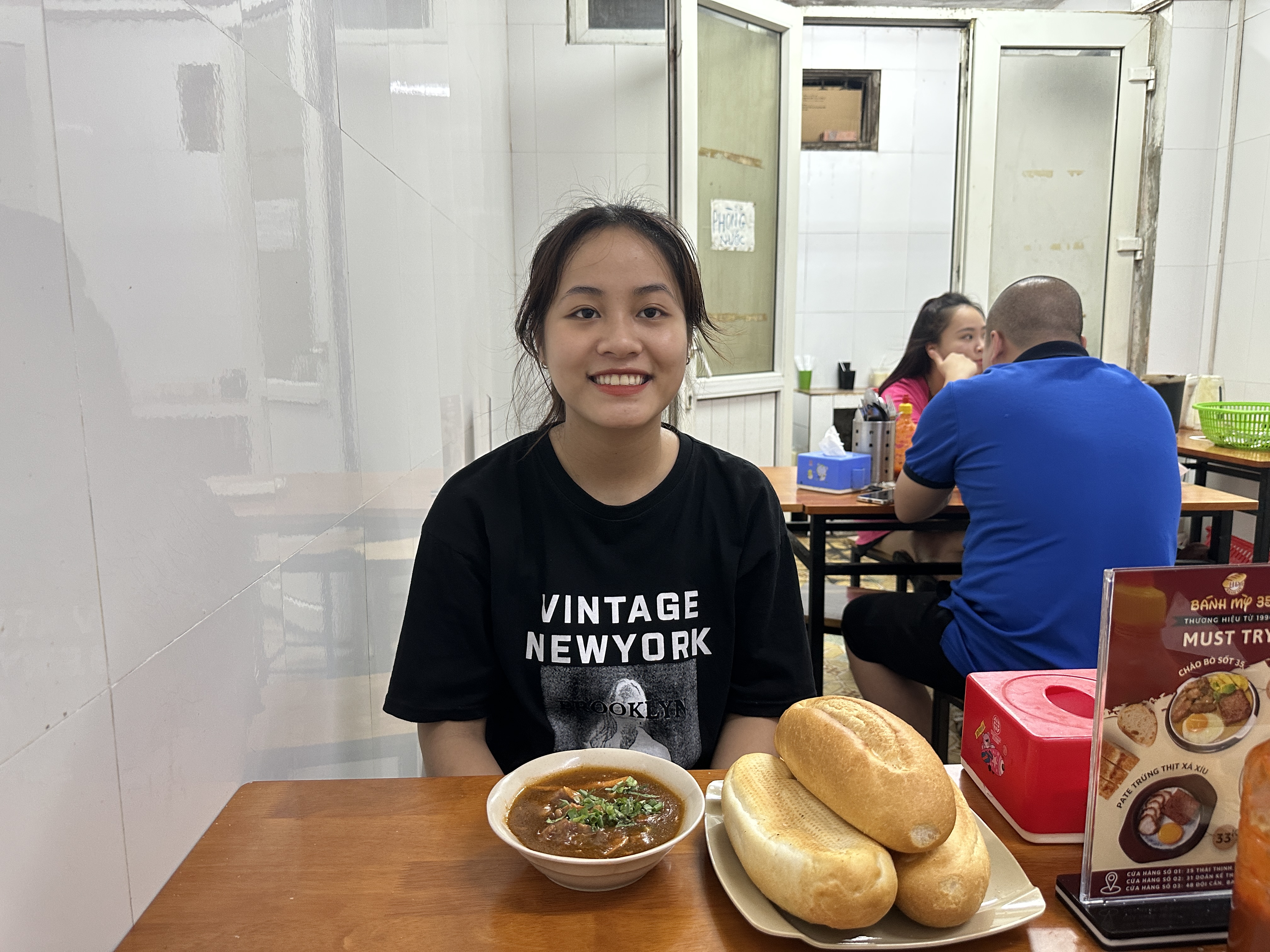 Bạn Hà Ngọc Thuý, khách quen của quán đến thưởng thức món bánh mì chấm sốt vang (bò kho). Ảnh Minh Anh |