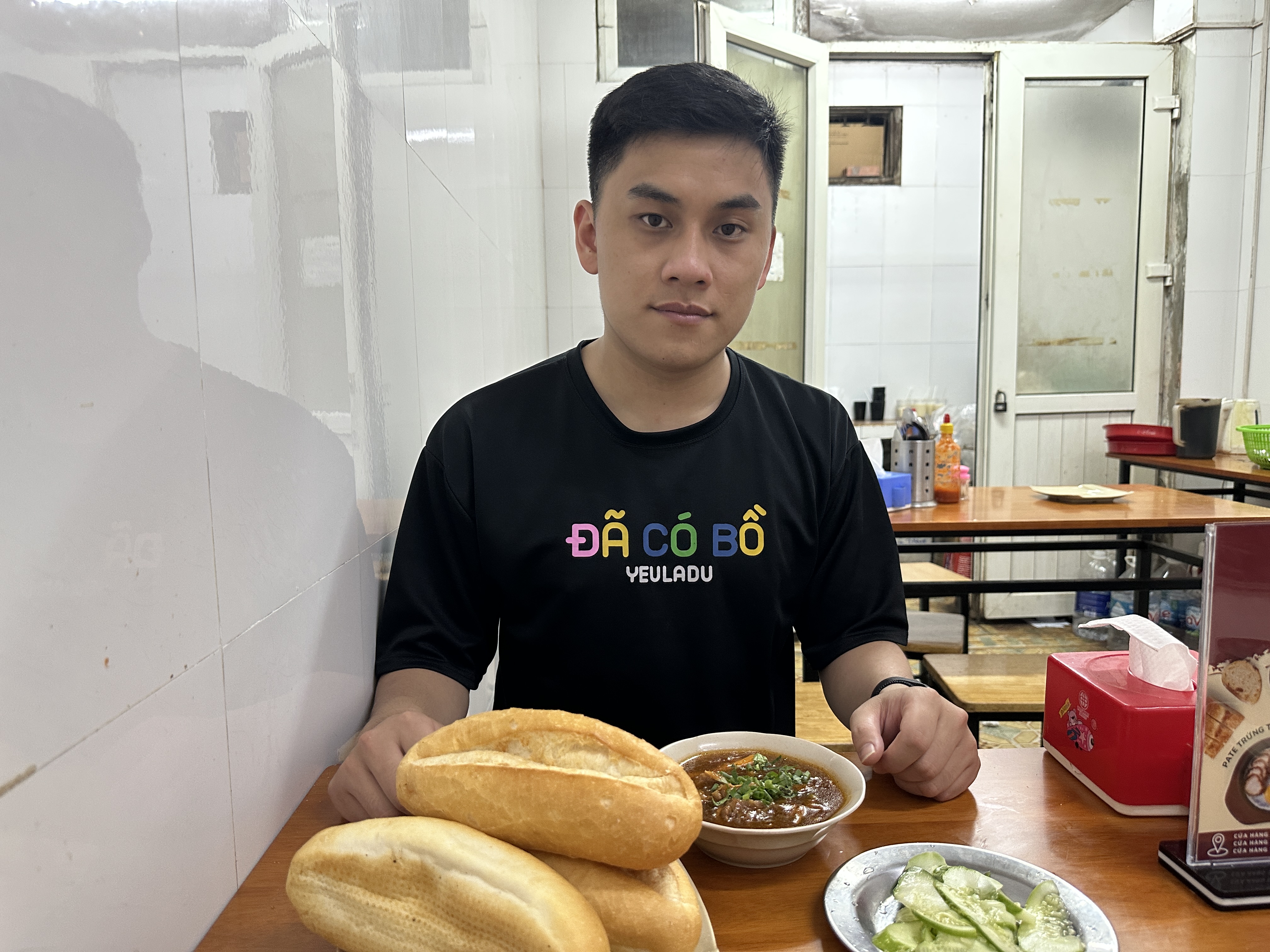 Anh Nguyễn Thành Trung đang thưởng thức món bò kho vô cùng hấp dẫn. Ảnh Minh Anh |
