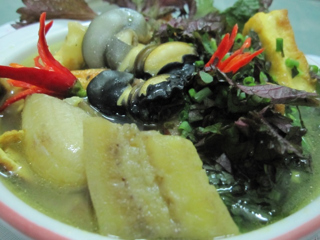 (VOV5) - Nếu có dịp đi về miền Tây trong mùa lũ, bạn hãy tìm cơ hội để thưởng thức món ăn dân dã “lẩu ốc cơm mẻ nấu chuối xanh” này. Dùng vá múc miếng thịt ốc, lẫn chuối xanh, tàu hũ, thịt ba rọi, lá tía tô, lá lốt cùng một ít nước dùng cho vào chén với bún. Gắp từng thứ cho vào miệng nhai một cách chậm rãi, bạn sẽ “ngậm mà nghe” vị dai sần sật của thịt ốc, bùi bùi của chuối xanh, béo béo của thịt ba rọi, hòa cùng hương thơm đặc trưng của cơm mẻ, của tinh dầu lá lốt, lá tía tô... thật quyến rũ.