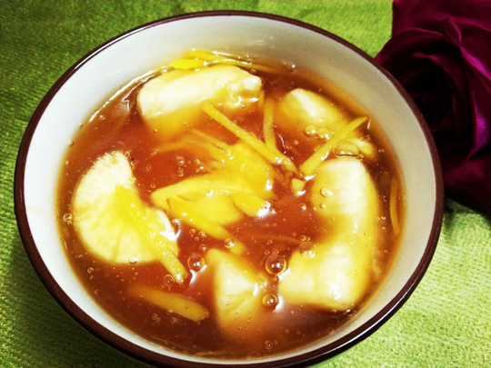 Chỉ cần một miếng gừng nhỏ là đủ cho một nồi chè năm bảy chén. Gừng cắt sợi, cho vào nồi nấu cùng. Đường tan, ngoại cho sắn đã cắt miếng vào nấu trên lửa liu riu. Khi miếng sắn đã đượm vị ngọt thanh của đường, ngoại tôi sẽ cho ít bột lọc đã pha sẵn trong chén nước, đổ từ từ vào nồi chè rồi khuấy đều, để nồi chè thêm sóng sánh.