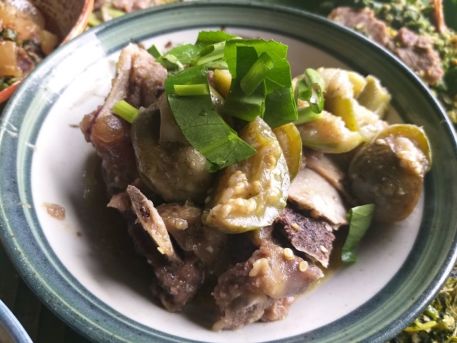 Và, bởi thế, một món ăn không thể bỏ qua, là hương vị của món canh cà đắng, một loại cà thường mọc hoang trên nương rẫy. Hầu như nhà của người Ê đê nào cũng có loài cây này. Họ dùng cà nhiều trong các bữa cơm gia đình, trong số đó có món canh nấu với cá khô: “Canh cà đắng bình thường em sẽ nấu với cá cơm khô. Còn không em sẽ hầm xương bò, nấu với thịt bò. Còn canh cà đắng này em nấu với đậu rồng. đun nước sôi, khi cà đắng chín thì vớt ra, giã nát, thả đậu rồng, đun sôi lại rồi cho gia vị nêm nếm. Cho lá é sẽ có mùi thơm của canh cà đắng."