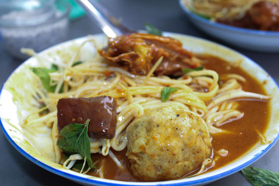 Bánh tằm cho ra dĩa, chịu khó gỡ rời sợi bánh, sau đó cho giá, rau quế, xà lách, huyết, xíu mại và thịt gà lên trên, người bán lấy muỗng chan nước xốt cà ri sền sệt, nóng hôi hổi lên làm bánh thấm vị cay thơm.