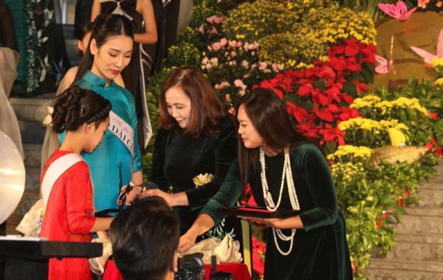 Nhà thiết kế, nghệ nhân áo dài Lan Hương (bên trái) và bà Việt Triều ký lên "Cặp áo dài của chúng ta" trong sự kiện triển lãm áo dài với chủ đề “Việt Nam, dáng vóc trường tồn” |