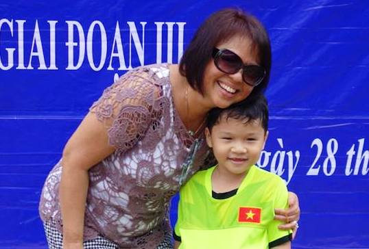 Bà Thanh Bình Rybacki và một cháu bé tại trường mầm non Hiếu Nghĩa, tỉnh Vĩnh Long - nơi COPI tài trợ xây dựng từ năm 2009 và đang tiếp tục mở rộng các lớp học, phòng ăn cho các con. |