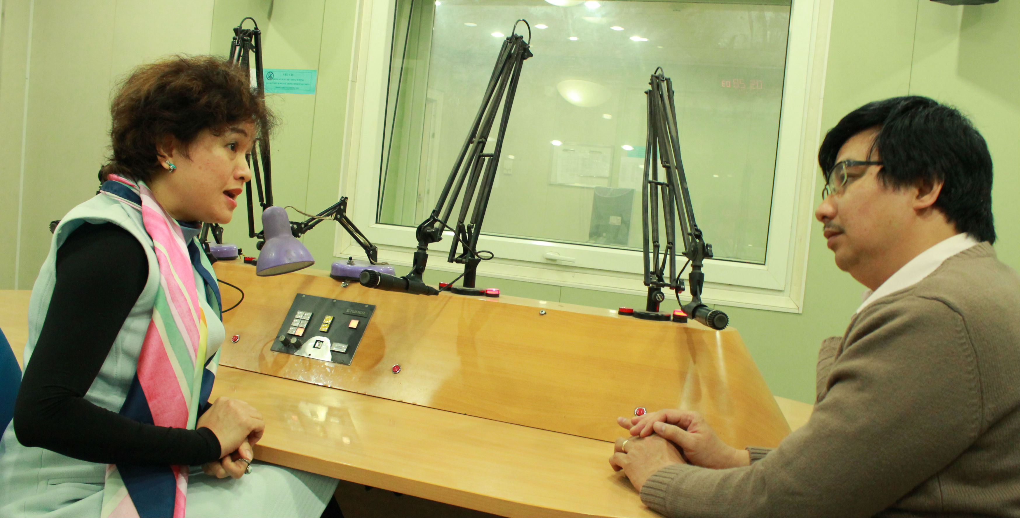 Chị Nguyễn Thị Hương Liên trả lời phỏng vấn tại phòng thu Đài Tiếng nói Việt Nam