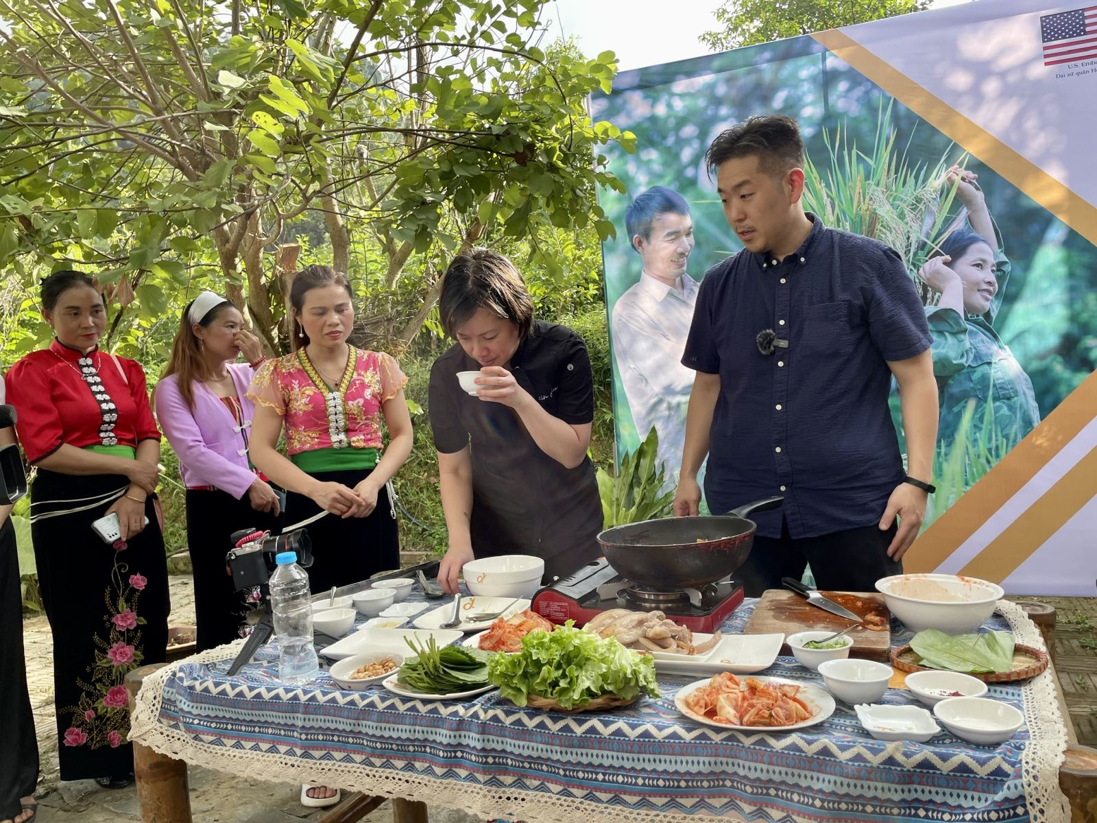 Christine Hà trổ tài nấu bếp với phụ nữ dân tộc ở Sơn La. Ảnh baotuoitre.vn |