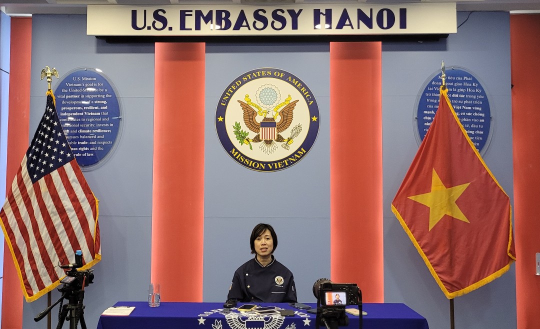 Vua đầu bếp mùa thứ 3Christine Hà, sứ giả văn hóa của Đại sứ quán Mỹ giao lưu tại Trung tâm văn hóa Mỹ. Ảnh Hà Linh |