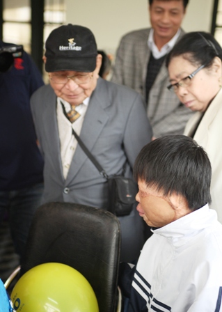 | Ông bà Đỗ Ngọc Quang - Lê Thị Hòa hỏi thăm bé Thường - một trong những số phận kém may mắn đang được tổ chức DFRO hỗ trợ kinh phí phẫu thuật và cấp học bổng. |
