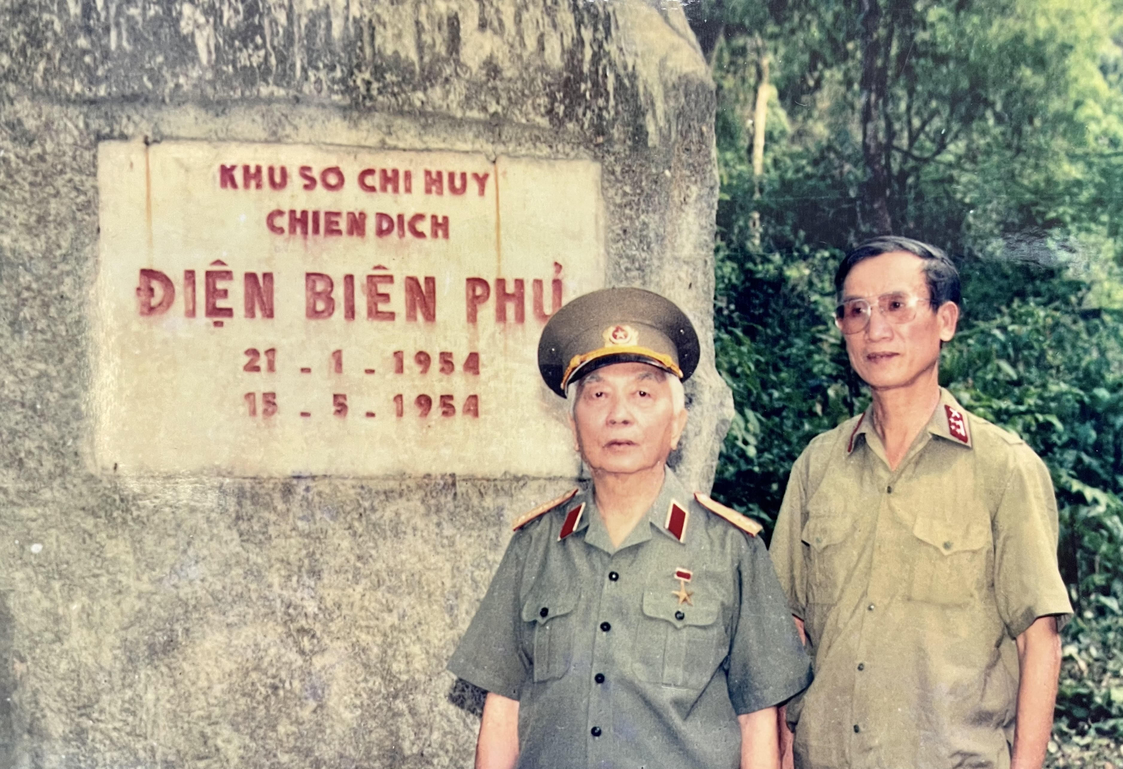 Đại tướng Võ Nguyên Giáp chụp ảnh cùng Đại tá Trần Huy Khuông tại Khu di tích Mường Phăng |