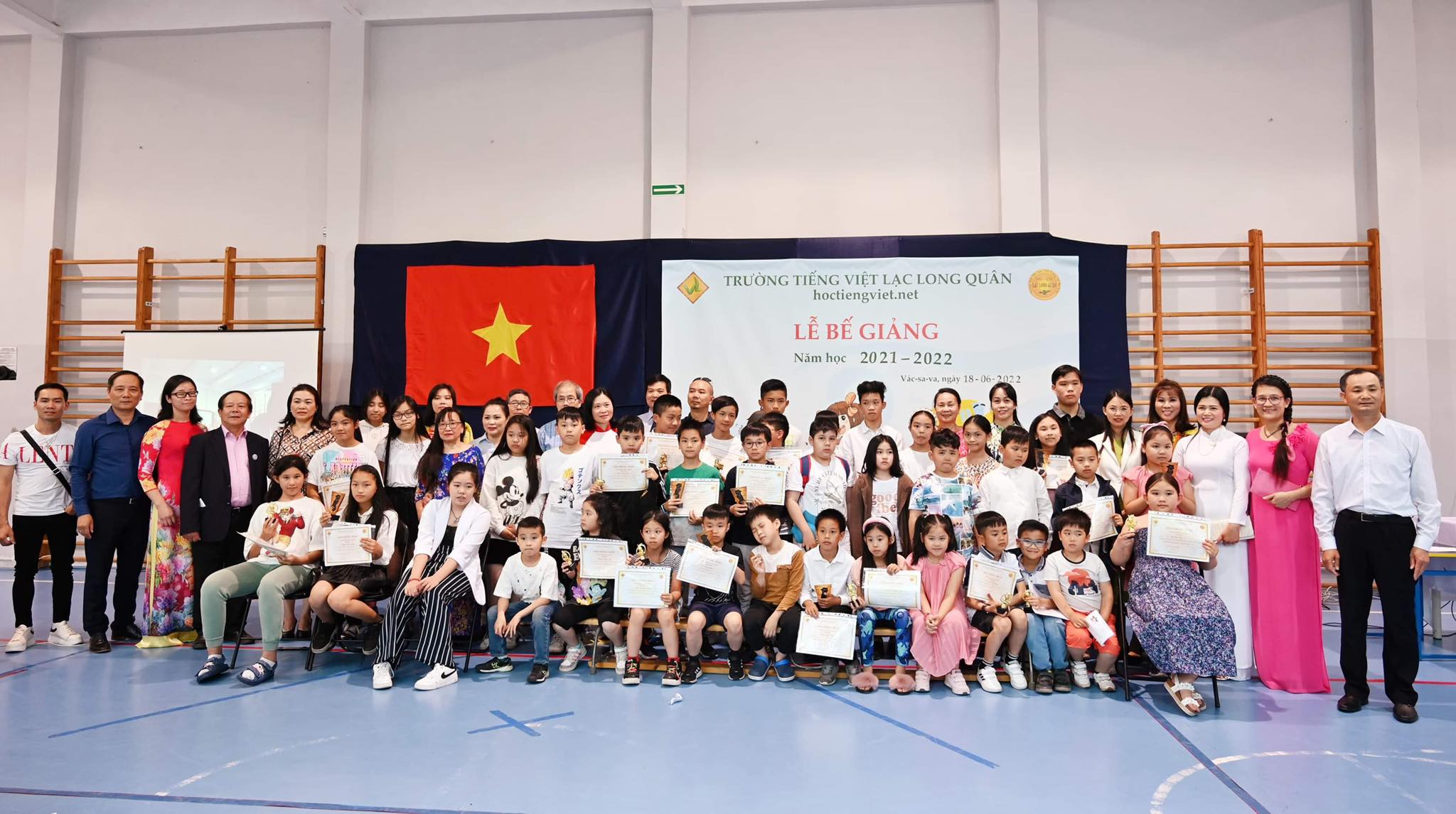 Các học sinh được trao phần thưởng tại lễ bế giảng trường tiếng Việt Lạc Long Quân năm 2022, lần tụ hội trực tiếp đầu tiên sau hai năm học trực tuyến vì covid. - Ảnh: Trường Lạc Long Quân |