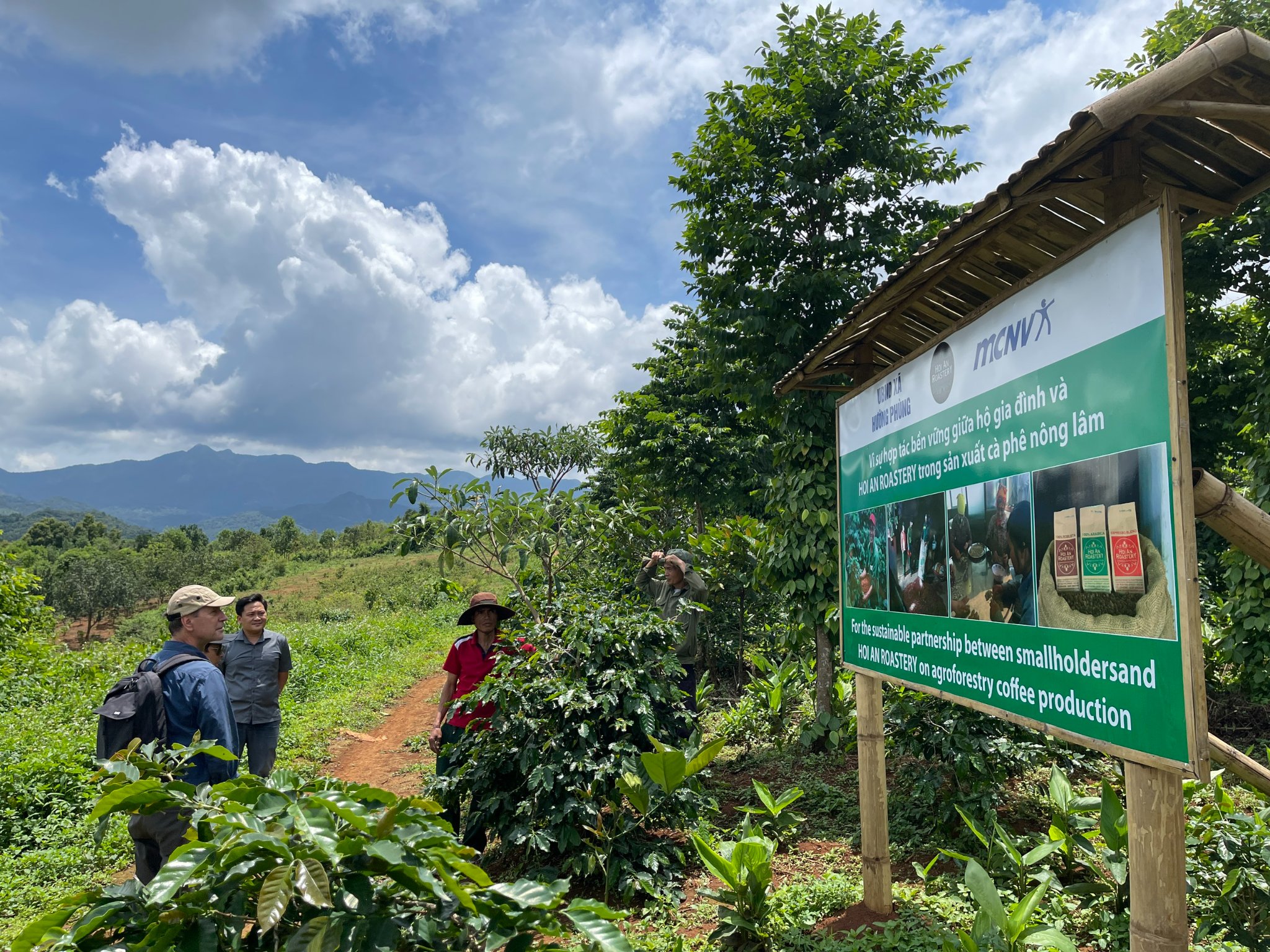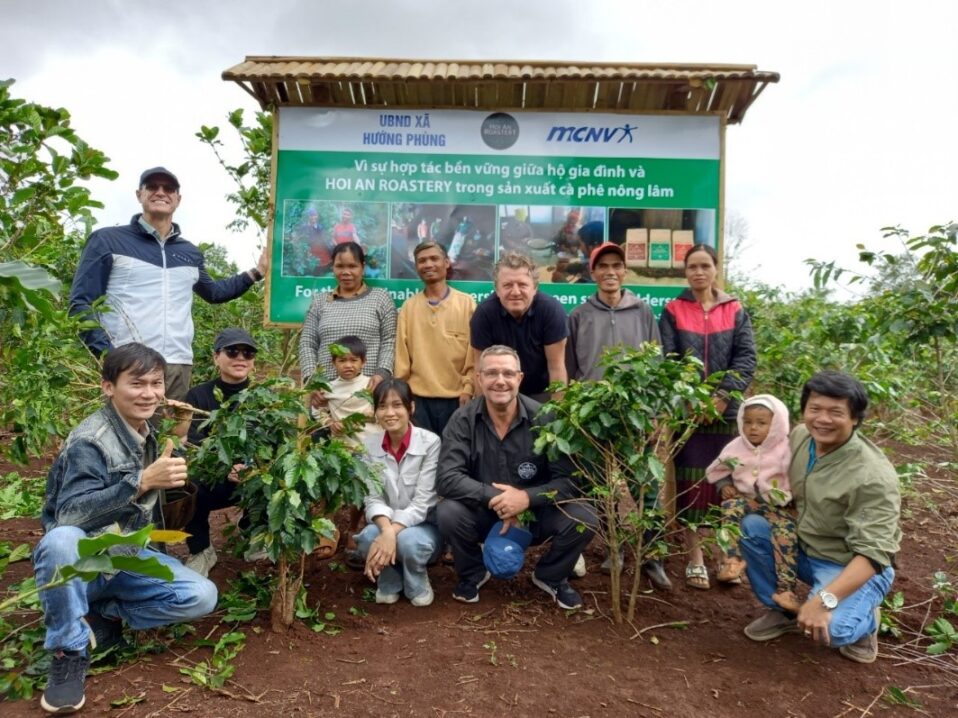 Các chuyên gia và cán bộ MCNV tại trang trại một hộ gia đình trồng cây cafe ở xã Hướng Phùng |