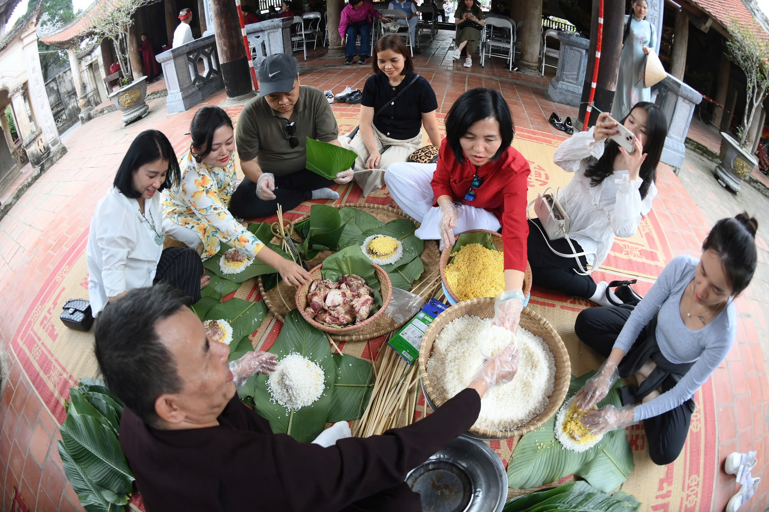 Du khách trải nghiệm gói bánh trưng tại đình cổ Hùng Lô.