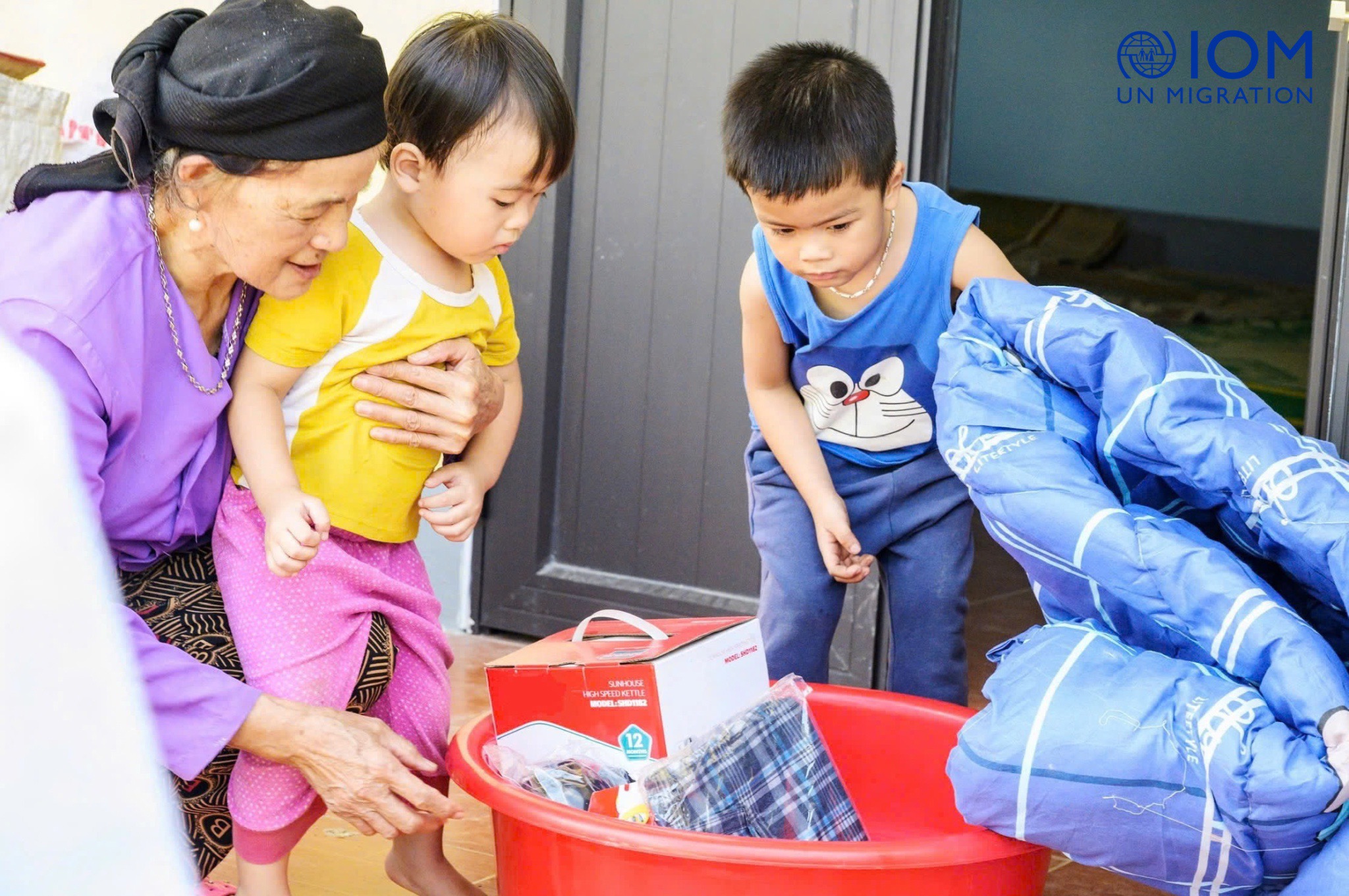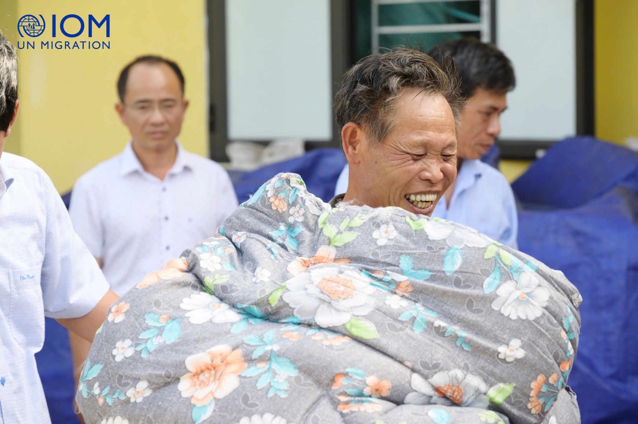 Niềm vui của người dân khi nhận được chăn ấm và các vật dụng gia đình từ Tổ chức Di cư quốc tế tại Việt Nam. Ảnh IOM |