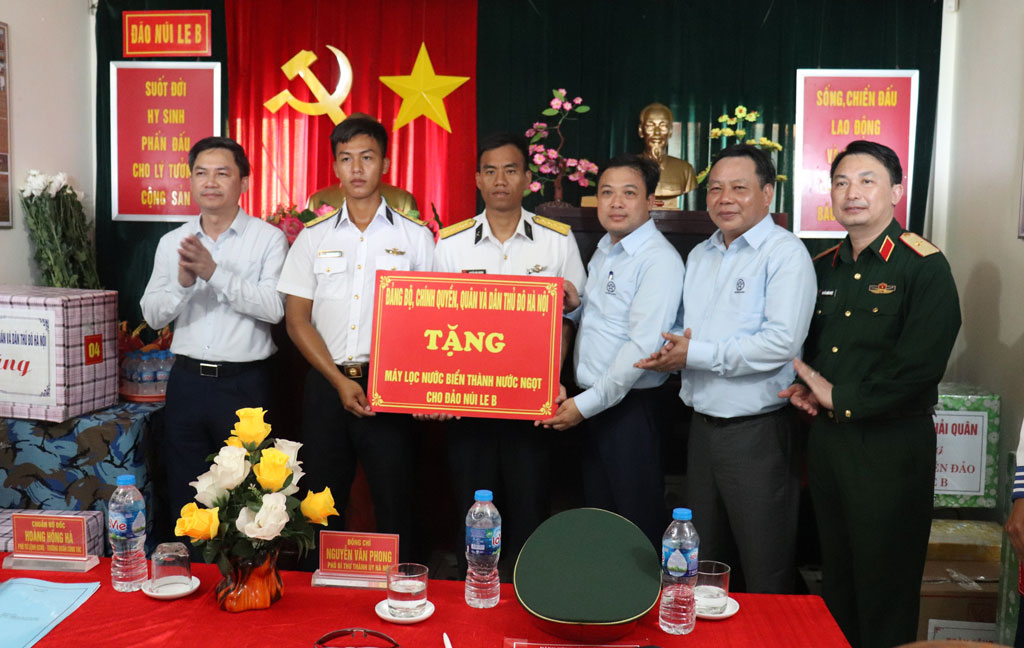Phó Bí thư Thành ủy Nguyễn Văn Phong và lãnh đạo thành phố Hà Nội tặng máy lọc nước biển thành nước ngọt cho cán bộ, chiến sĩ đảo Núi Le B. Ảnh: hanoimoi |