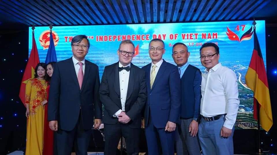 Kỷ niệm 77 năm ngày Quốc khánh 02.09.2022 cùng với Đại sứ đặc mệnh toàn quyền CHXHCN Việt Nam tại Đức,ông Nguyễn Văn Hiền, TGĐ TTTM Đồng Xuân Berlin, ông Lê Quang Long Tổng lãnh sự quán Việt Nam tại Frankfurt và Mr. Ludwig Westarp, Đại diện Hội doanh nghiệp vừa và nhỏ Đức tại Việt Nam. Ảnh nvcc |