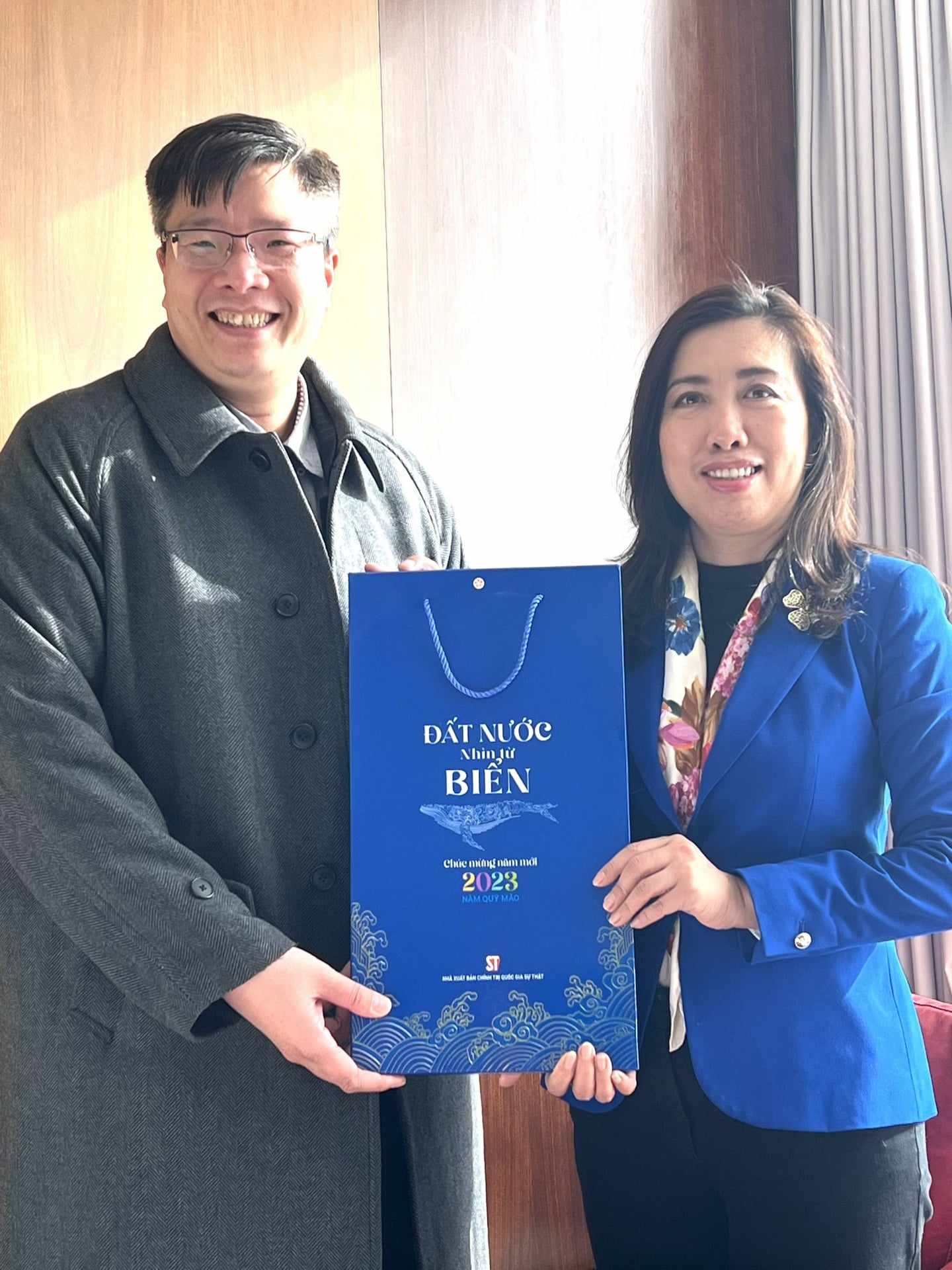 Thứ trưởng Bộ Ngoại giao Lê Thị Thu Hằng tặng lịch cho VKBIA với mong muốn kiều bào hướng về Tổ quốc và phát triển kinh tế xanh - kinh tế biển.