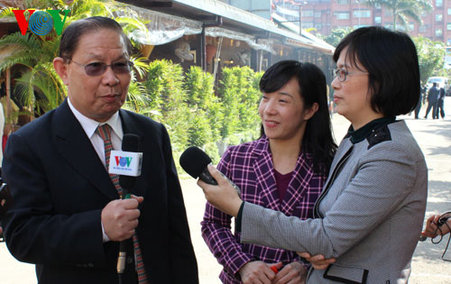 | Chị Hoàng Oanh (giữa) đang phiên dịch cho quan chức Tổng Cục dân di dân Đài Loan trả lời phỏng vấn phóng viên Đài Tiếng nói Việt Nam. |