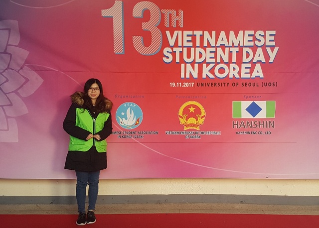 Nguyễn Thị Nhật Uyên: Khi em được chọn tham gia vào Ban tình nguyện viên của Ngày hội sinh viên Việt Nam tại Hàn Quốc năm 2017 em cảm thấy vui bởi quy mô lớn hơn những năm trước. Khi được chọn vào ban tình nguyện viên, em cảm giác như mình được đóng góp chút sức lực nhỏ bé của mình cho cộng đồng nên rất vui.