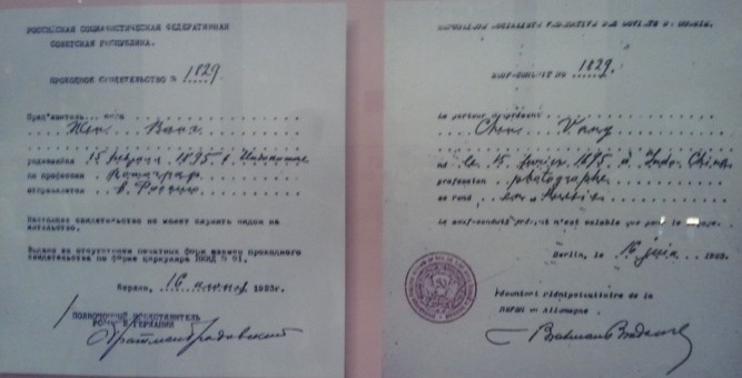Các nhà lưu trữ đã cẩn thận giữ gìn giấy chứng nhận cho phép nhập cảnh dưới cái tên nhiếp ảnh gia Chen Vang, người đi du lịch. Giấy chứng nhận do đại diện của Liên Xô ở Đức cấp thay cho hộ chiếu. Nhiếp ảnh gia Chen Vang đi trên tàu thủy của Đức vào Petrograd (tức Saint Petersburg ngày nay) ngày 30/6/1923. Tấm ảnh của Hồ Chí Minh thời trẻ dán trên tấm giấy chứng nhận và dấu của đồn biên phòng cảng Petrograd ghi rõ ngày nhập cảnh của vị hành khách nước ngoài là minh chứng cho điều đó.