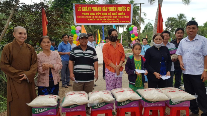 Chư Tôn đức Tăng Ni và chính quyền xã Vĩnh Xuân, huyện Trà Ôn, tỉnh Vĩnh Long tặng 65 suất quà hỗ trợ các hộ dân có hoàn cảnh khó khăn ở địa phương. Ảnh Trúc Mai/phatsuonline.vn |