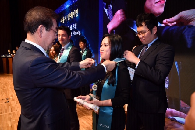 PV: Chào Minh Phương, là người Việt Nam đầu tiên trong cộng đồng người Việt tại Hàn Quốc được thị trưởng thành phố Seoul trao tặng danh hiệu “Công dân danh dự Seoul”, bạn hãy nói một chút về giải thưởng này.?