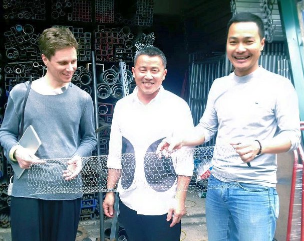 Từ phải sang: Anh Lê Việt Hà, nghệ sĩ cảnh quan Andy Cao và Xavier Perrot cùng vật liệu làm mây pha lê |