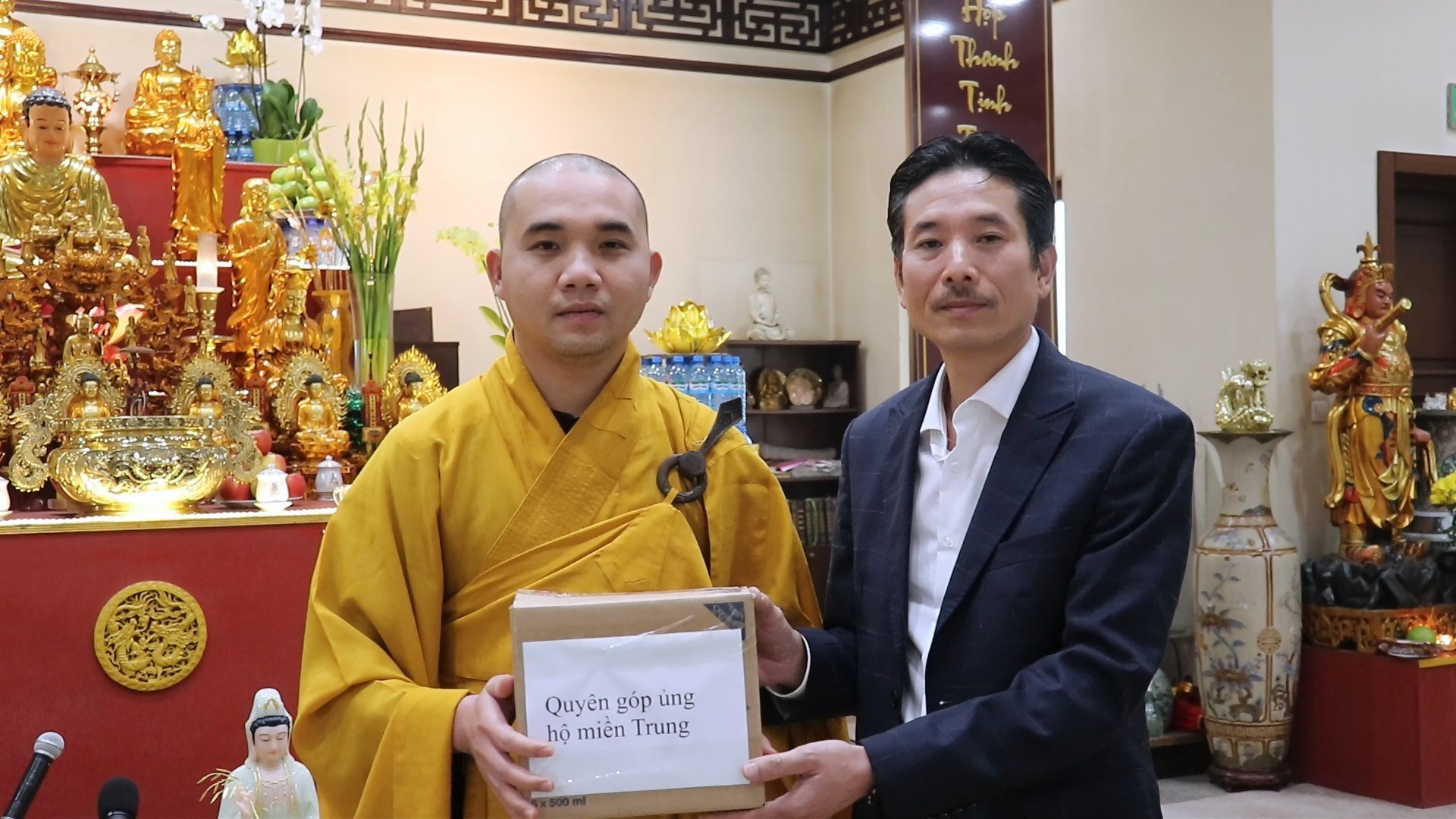 Đại đức Thích Trung Đạt, tri sự chùa Nhân Hòa, Ba Lan trao tiền quyên góp ủng hộ miền Trung của chùa Nhân Hòa cho Đại diện Hội Người Việt Nam tại Ba Lan. |