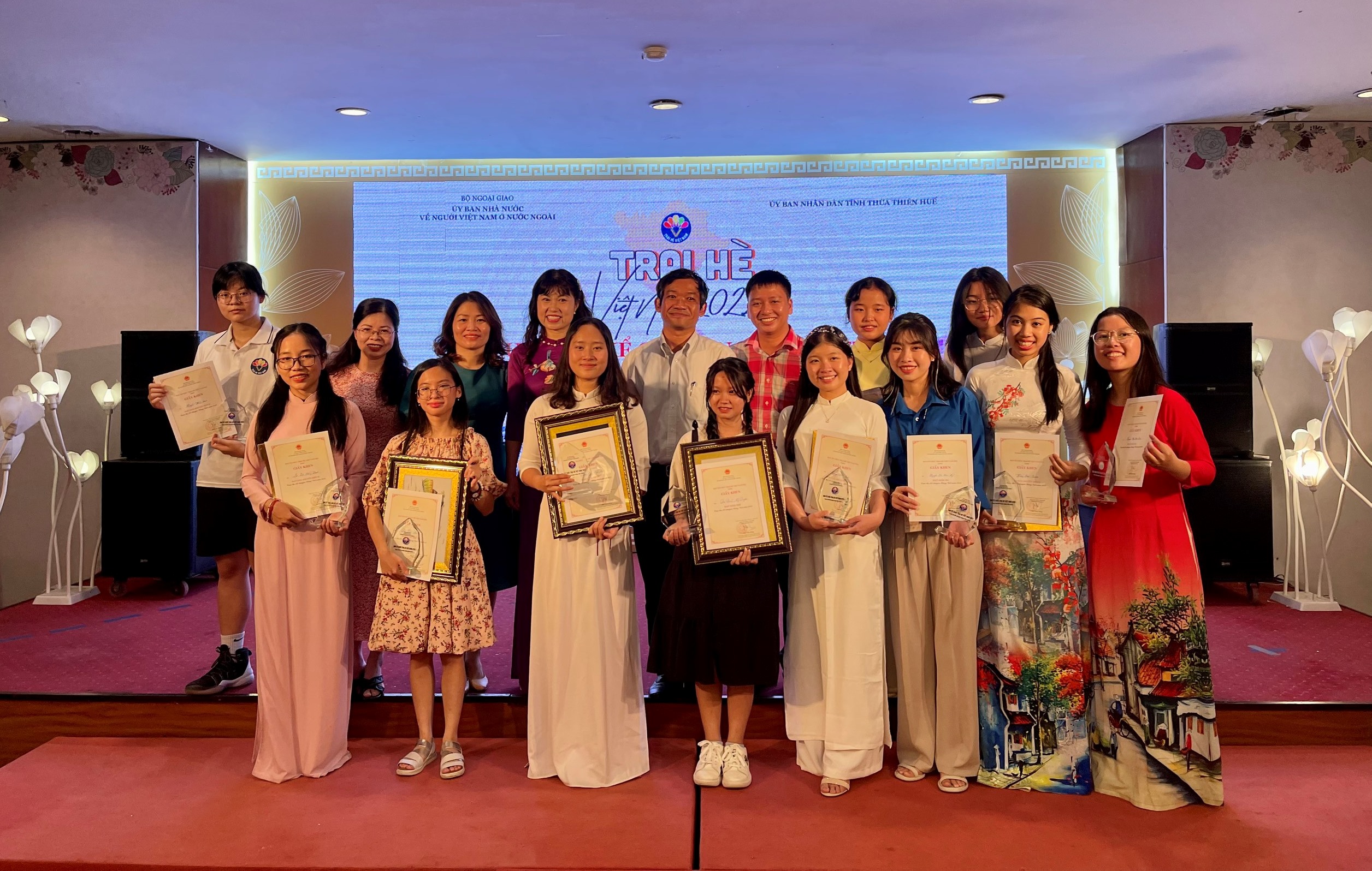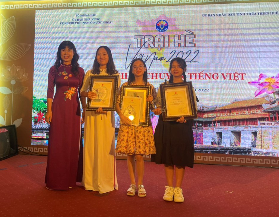 Bà Nguyễn Thị Thuận chụp ảnh cùng Phan Thị Ngọc Ánh, kiều bào Ucraina (thứ hai từ trái sang), giải Nhất và Đào Vân Anh, kiều bào Liên bang Nga, Đào Đặng Mỹ Duyên thuộc Trung tâm bảo trợ trẻ em FHF, Huế, đạt giải nhì. |