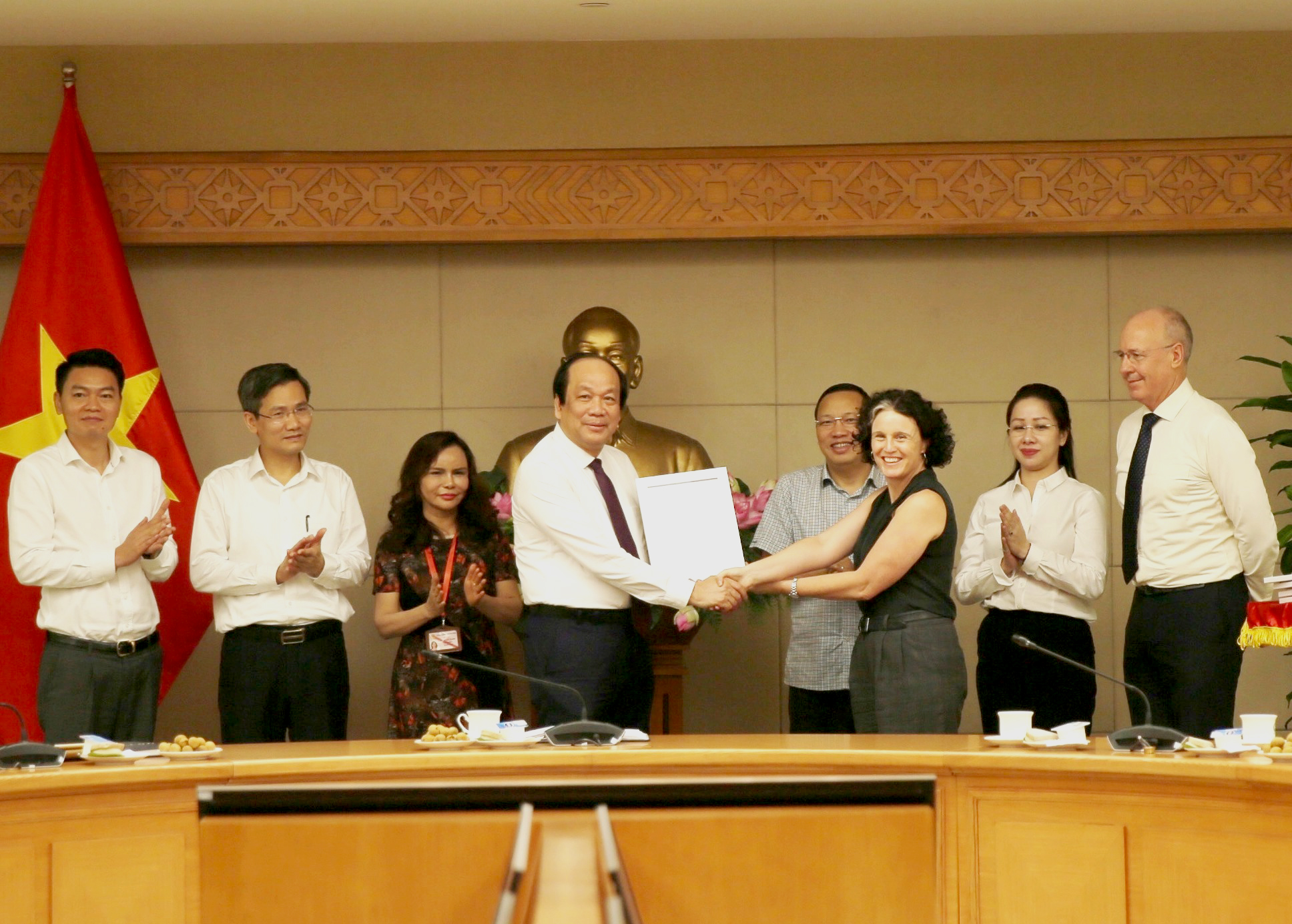 Phó Đại sứ Rebecca Bryant và Bộ trưởng Chủ nhiệm Văn phòng Chính phủ Mai Tiến Dũng tại lễ bế giảng khóa học đào tạo tiếng Anh dành cho lãnh đạo cấp cao của Văn phòng Chính phủ - một hoạt động do Chính phủ Australia tài trợ - tháng 6/2020 |