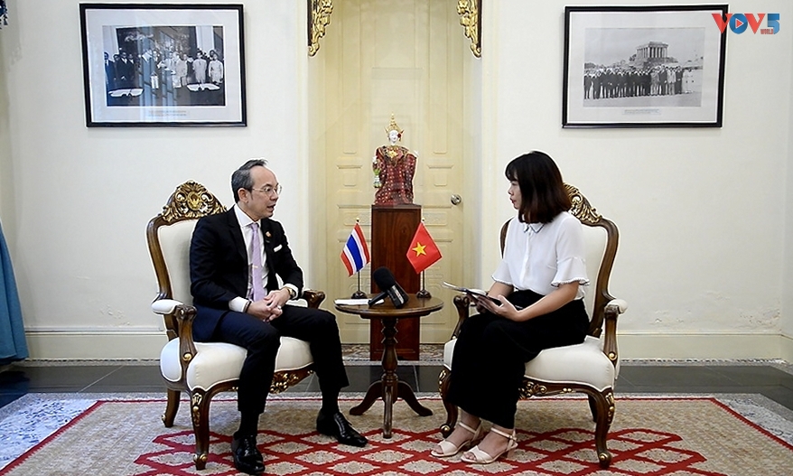 PV: Xin chân thành cảm ơn Đại sứ đã dành thời gian trả lời phỏng vấn phóng viên VOV nhân dịp kỉ niệm 45 năm thiết lập quan hệ Ngoại giao Việt Nam - Thái Lan. Trải qua nhiều giai đoạn lịch sử, Việt Nam và Thái Lan đã chính thức trở thành “Đối tác chiến lược” vào năm 2013 và được xem là hai nước đầu tiên trong khối ASEAN xác lập mối quan hệ này. Tiếp đó, năm 2019, hai bên nâng tầm thành “Đối tác chiến lược tăng cường” nhằm thúc đẩy sự hợp tác mạnh mẽ và toàn diện hơn nữa. Hai bên đã thực hiện nó như thế nào thưa ông?