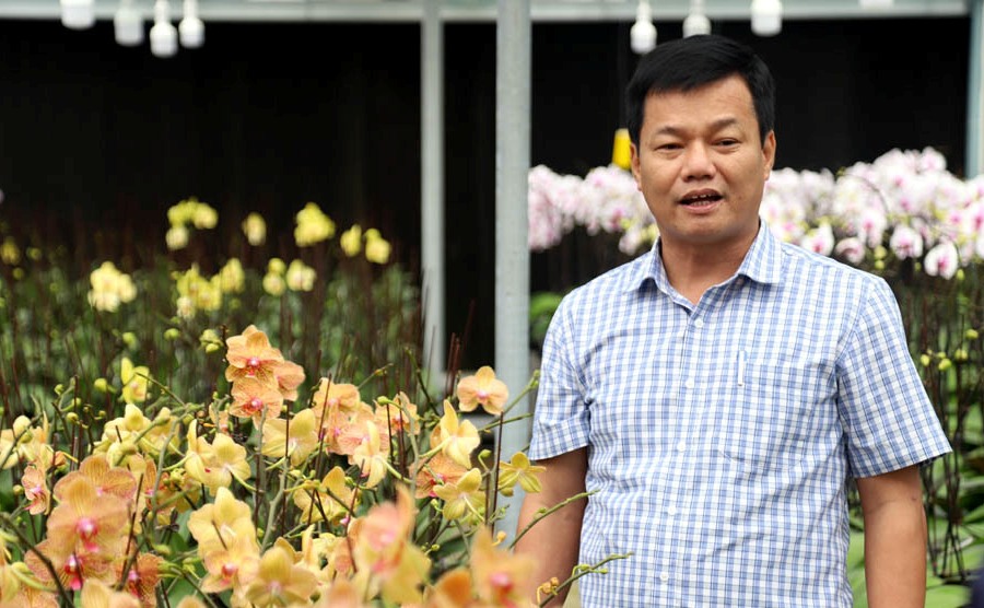 Ông Đào Ngọc Hoàng, Giám đốc Trung tâm Nghiên cứu, Ứng dụng và Thông tin KH&CN tỉnh Quảng Trị bên vườn hoa đang vào vụ. |