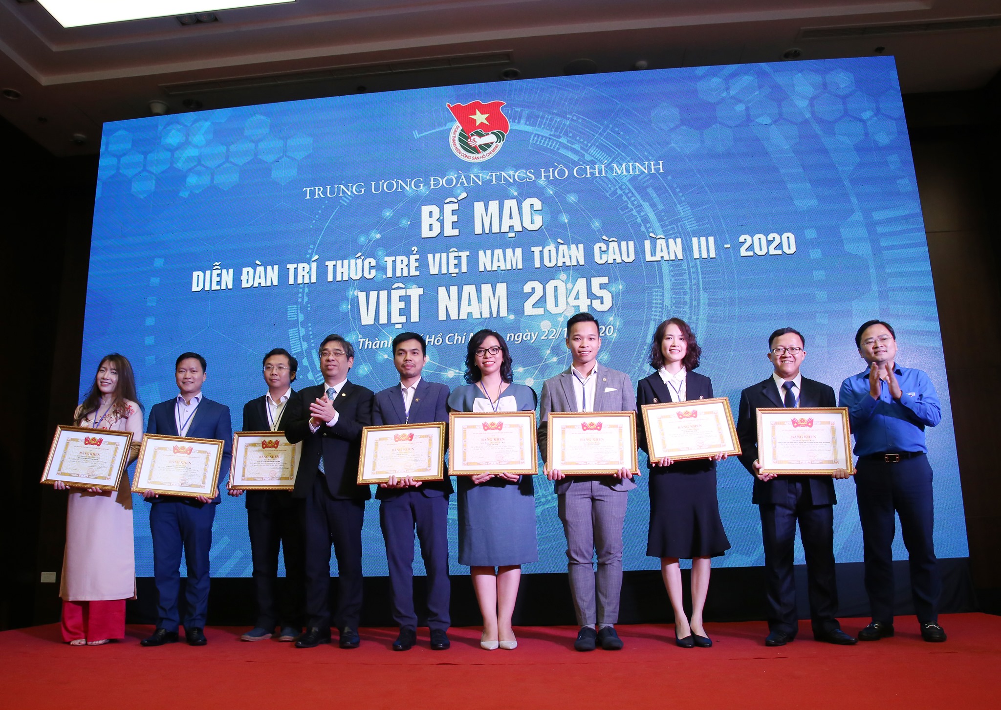 TS Trần Lê Hưng (bìa trái thứ 4) vinh dự nhận Bằng khen do Đoàn TNCS Hồ Chí Minh trao tặng. Ảnh nhân vật cung cấp |