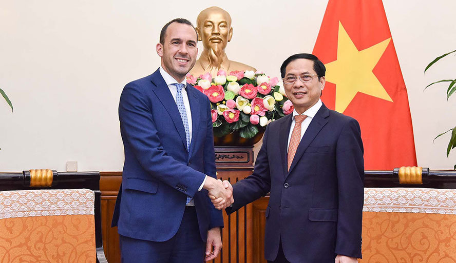 Bộ trưởng Bộ Ngoại giao Bùi Thanh Sơn và Thứ trưởng Ngoại giao Italia Manlio Di Stefano. Ảnh Kim Phượng |