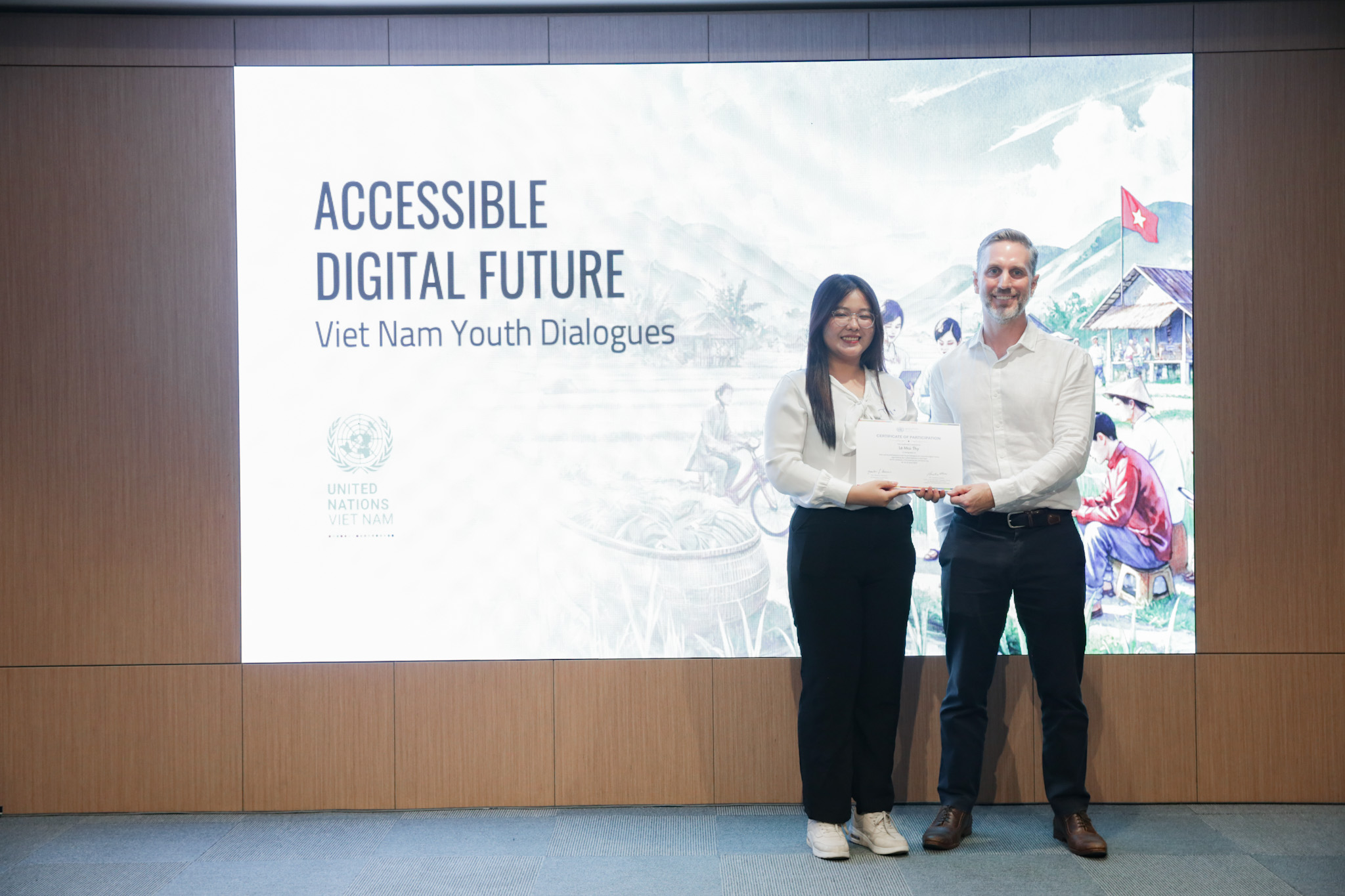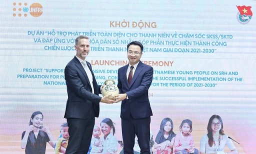 Ông Matt Jackson và Nguyễn Tường Lâm, Bí thư T.Ư Đoàn, Phó chủ tịch Hội Liên hiệp thanh niên Việt Nam tại Lễ khởi động Dự án hỗ trợ thanh niên gia đoạn 2021- 2030. Ảnh UNFPA cung cấp |