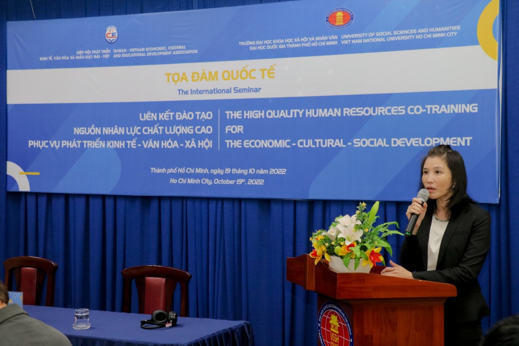 Bà Ngô Phẩm Trân, Chủ tịch Hiệp hội Phát triển Kinh tế - Văn hoá - Giáo dục Đài - Việt, phát biểu khai mạc tọa đàm liên kết quốc tế. Ảnh: Lý Nguyên/hcmussh.edu.vn |