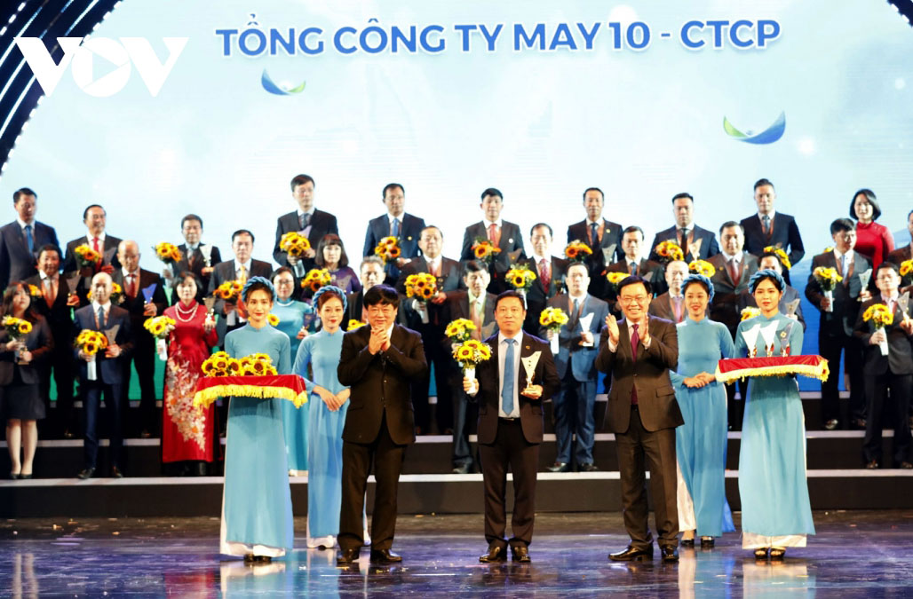Tổng Giám đốc Đài Tiếng nói Việt Nam Nguyễn Thế Kỷ và Bí thư Thành ủy Hà Nội Vương Đình Huệ trao tặng cúp cho doanh nghiệp. - Ảnh: VOV |