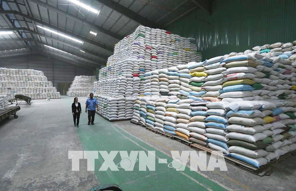 Sản phẩm gạo xuất khẩu được tạm trữ tại kho của công ty Lương thực Sông Hậu (Sông Hậu Food) thành phố Cần Thơ - Ảnh: Vũ Sinh/ TTXVN |