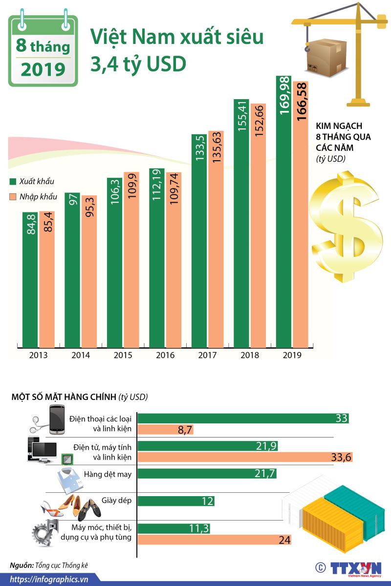Đáng lưu ý, nhờ đóng góp của nhóm hàng điện thoại và linh kiện nên cán cân thương mại tháng 8 đã nghiêng về xuất siêu với 1,7 tỷ USD. Như vậy, tỉnh tổng 8 tháng xuất siêu của cả nước đạt 3,4 tỷ USD; trong đó có 26 mặt hàng đạt giá trị xuất khẩu trên 1 tỷ USD.