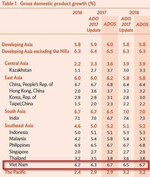 Tại Việt Nam, triển vọng tăng trưởng được điều chỉnh tăng lên 6,7% cho cả hai năm 2017 và 2018. Trong ba quý đầu năm 2017, tăng trưởng GDP đạt 6,4% so với mức 5,9% cùng kỳ năm trước.