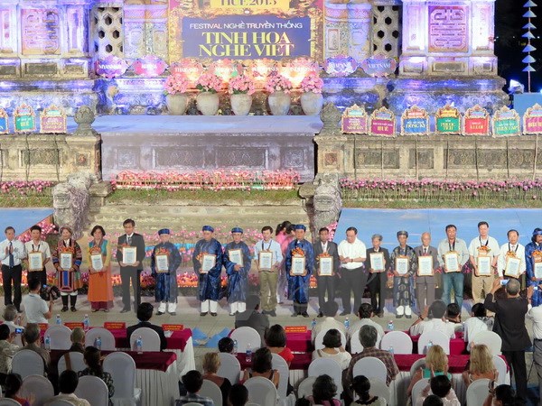 Tại lễ bế mạc, UBND thành phố Huế trao giấy chứng nhận cho 80 nghệ nghệ nhân tiêu biểu đại diện cho các làng nghề trong nước và nước ngoài tham gia Festival nghề truyền thống Huế 2015./.