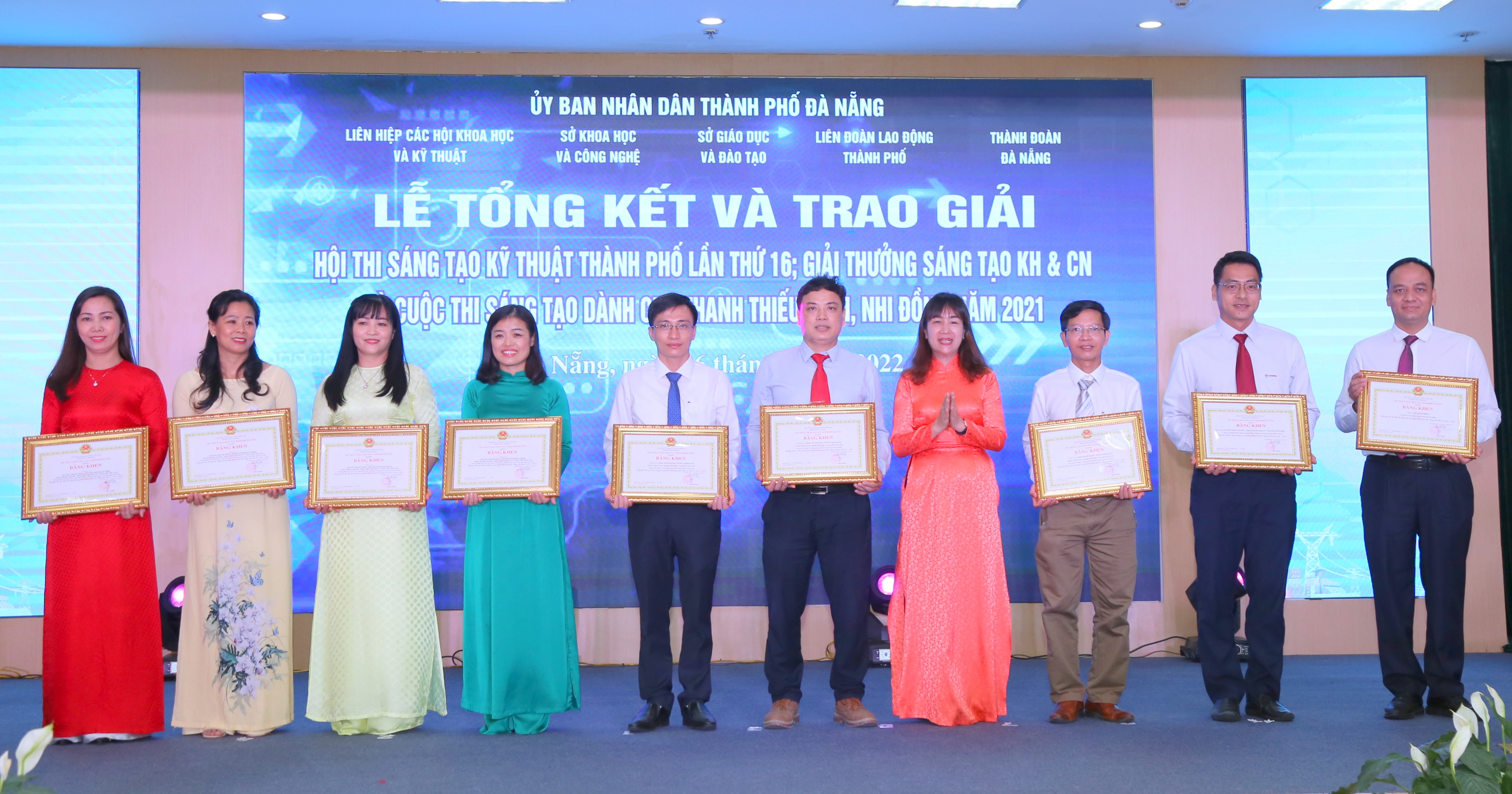 Anh Nguyễn Thảo Nguyên (thứ hai từ phải sang), đại diện nhóm tác giả nhận giải thưởng trong Hội thi sáng tạo kỹ thuật thành phố lần thứ 16; Giải thưởng sáng tạo KH&CN do UBND thành phố Đà Nẵng tổ chức. |