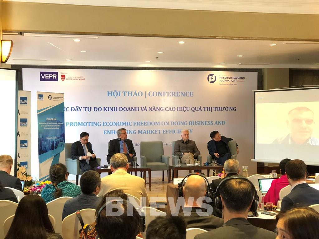 Toàn cảnh hội thảo “Thúc đẩy tự do kinh doanh và nâng cao hiệu quả thị trường”. Ảnh: Ngọc Quỳnh/BNEWS/TTXVN |