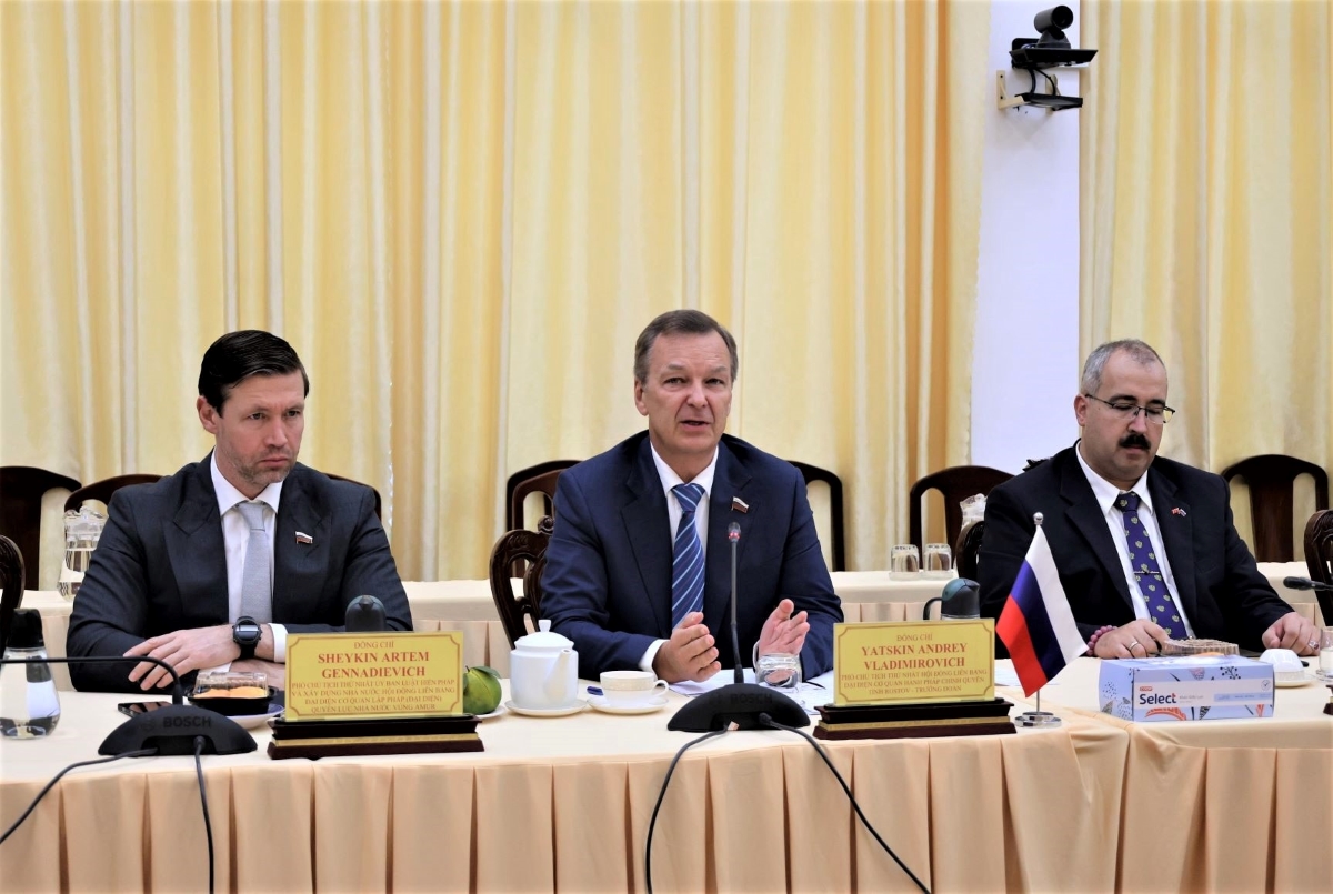 Phó Chủ tịch thứ nhất Hội đồng liên bang Quốc hội Liên bang Nga A.V. Yatskin (giữa) trao đổi với lãnh đạo TP. Cần Thơ. Ảnh: daibieunhandan.vn |