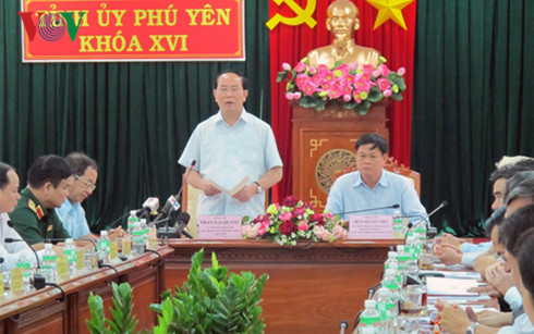 Cùng ngày, tại buổi làm việc ngày 27/06 với lãnh đạo tỉnh Phú Yên Chủ tịch nước Trần Đại Quang cho rằng để đạt được những mục tiêu, nhiệm vụ, giải pháp phát triển kinh tế xã hội, bảo đảm quốc phòng - an ninh, xây dựng hệ thống chính trị giai đoạn 2015 - 2020 mà tỉnh đã đề ra, Phú Yên cần tập trung phát triển công nghiệp - xây dựng, nhất là một số ngành có lợi thế cạnh tranh, như: công nghiệp phụ trợ, năng lượng sạch, chế biến nông - lâm - thủy sản; đồng thời, tỉnh cần có chính sách hỗ trợ, thúc đẩy các doanh nghiệp nhỏ và vừa, các cơ sở sản xuất tiểu thủ công nghiệp, làng nghề phát triển để xuất khẩu; đẩy mạnh phát triển kết cấu hạ tầng giao thông, huy động các nguồn lực đẩy nhanh tiến độ triển khai thi công các công trình trọng điểm. Cùng với đó, Phú Yên cần tập trung xây dựng khu kinh tế Nam Phú Yên thành một trong những trung tâm công nghiệp, cảng biển lớn của vùng duyên hải Nam Trung Bộ và Tây Nguyên; phát triển du lịch trở thành ngành kinh tế quan trọng mũi nhọn, đa dạng hóa và nâng cao chất lượng các sản phẩm, dịch vụ du lịch; tăng cường liên kết với các địa phương trong vùng để phát triển du lịch, phát triển các sản phẩm du lịch có thế mạnh. Về nhiệm vụ phát triển nông nghiệp, Chủ tịch nước Trần Đại Quang yêu cầu tỉnh Phú Yên cần khuyến khích ứng dụng các tiến bộ khoa học - công nghệ nhằm nâng cao năng suất, chất lượng nông - lâm - thủy sản; xây dựng, triển khai mô hình liên kết theo chuỗi giá trị, trước mắt là trong đánh bắt cá ngừ đại dương; thực hiện tốt việc lồng ghép các chương trình, dự án đầu tư vào nông nghiệp, nông thôn gắn với xây dựng nông thôn mới.
