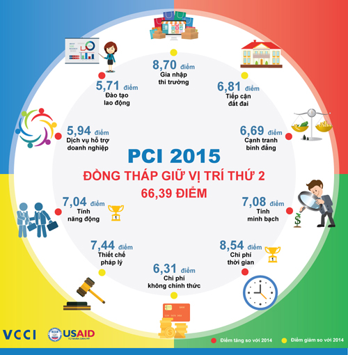 PCI là bộ chỉ số được sử dụng rộng rãi ở Việt Nam để đánh giá mức độ thuận lợi của thủ tục hành chính tại các cơ quan nhà nước cấp tỉnh khác nhau và mức độ hỗ trợ của chính quyền theo đánh giá của các doanh nghiệp dân doanh đang hoạt động tại địa phương. Trong tổng số 10 chỉ số thành phần đánh giá PCI năm 2015, Đồng Tháp có 2/10 chỉ số thành phần đứng đầu cả nước, đó là tính năng động của chính quyền và chi phí thời gian. Theo nhiều nhà đầu tư trên địa bàn, điểm mạnh của địa phương đó là sự năng động, quyết đoán của lãnh đạo tỉnh và đồng hành cùng doanh nghiệp. Đặc biệt, nơi nào có khó khăn, doanh nghiệp có vướng mắc đều được tỉnh đến tìm hiểu và giải quyết kịp thời. Ông Jo Hyung Tae, Giám đốc Công ty TNHH In Jae Đồng Tháp, với 100% vốn Hàn Quốc, cho biết công ty ông vừa được nhận giấy chứng nhận đầu tư của tỉnh chỉ sau thời gian ngắn hoàn thành thủ tục đăng ký. Cũng như nhiều nhà đầu tư đang có dự án sản xuất tại Đồng Tháp, ông Jo Hyung Tae tỏ ra lạc quan và đánh giá cao kết quả PCI 2015 mà Đồng Tháp đã đạt được: "Tôi đánh giá cao môi trường đầu tư của Đồng Tháp. Khi đến đây chúng tôi nhận được rất nhiều ưu đãi từ chính quyền. Tôi cảm thấy người dân ở Đồng Tháp thân thiện hài hòa. Thời gian qua, chúng tôi cũng nhận được sự hỗ trợ rất nhiều từ các Sở ngành. Sắp tới, công ty sẽ mở rộng dây chuyền và thu thêm công nhân nhằm giải quyết lượng lao động lớn cho tỉnh nói chung".