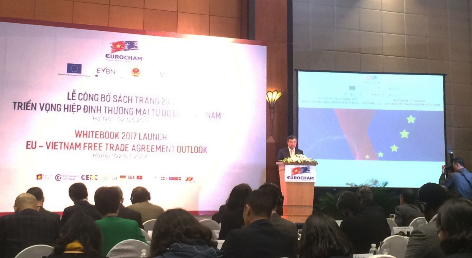 Sáng 2/3, tại Hà Nội, Hiệp hội Doanh nghiệp châu Âu tại Việt Nam (EuroCham) và Phòng Thương mại và Công nghiệp Việt Nam phối hợp tổ chức Lễ công bố Sách trắng 2017 Triển vọng Hiệp định thương mại tự do EU-Việt Nam. Đây là lần thứ 9 Sách trắng được công bố, nhằm cung cấp những thông tin, đánh giá cập nhật nhất về tình hình kinh tế, môi trường kinh doanh và môi trường pháp lý hiện nay tại Việt Nam.