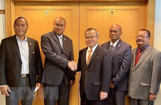 Đại sứ Vũ Hồng Nam (thứ ba, từ trái sang) và Bộ trưởng Nhân lực, Văn hóa, Du lịch và Phát triển Ngiraibelas Tmetuchl (thứ hai, từ trái sang). Ảnh: TTXVN |