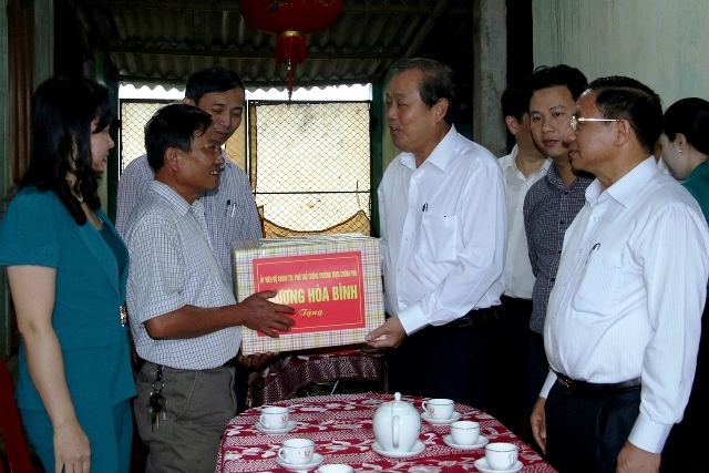 | Phó Thủ tướng Trương Hòa Bình tặng quà cho gia đình anh Mai - hộ gia đình nuôi trồng thủy sản trên sông Hộ Độ, Hà Tĩnh (Ảnh: Báo Nhân dân) |